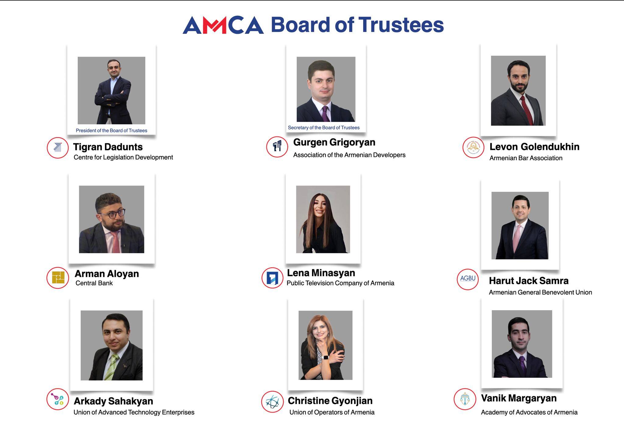 Հոգաբարձուների խորհուրդը բաղկացած է 3 տարի ժամկետով նշանակված 9 անդամից։ «Արբիտրաժի և հաշտարարության հայաստանյան կենտրոնի» հոգաբարձուների խորհրդի նախագահ է ընտրվել Տիգրան Դադունցը, իսկ քարտուղար՝ Գուրգեն Գրիգորյանը։